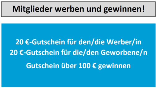 Jedes Neumitglied und dessen Werber/in erhält auf jeden Fall am Ende der Werbeaktion einen Gutschein im Wert von 20 Euro.*